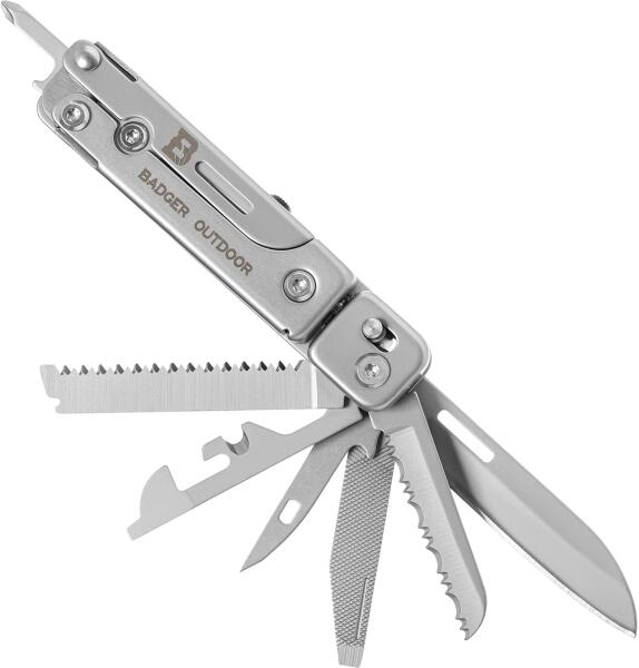 Multitool fabricat din oțel inoxidabil echipat cu 13 unelte. Greutatea redusă și dimensiunile compacte facilitează transportul și depozitarea uneltei într-un rucsac, buzunar sau pe curea. Este potrivit pentru sarcinile zilnice și reparațiile mici, precum și pentru camping și activități în aer liber.  Multitool-urile Badger Outdoor sunt acoperite de o garanție de 10 ani.