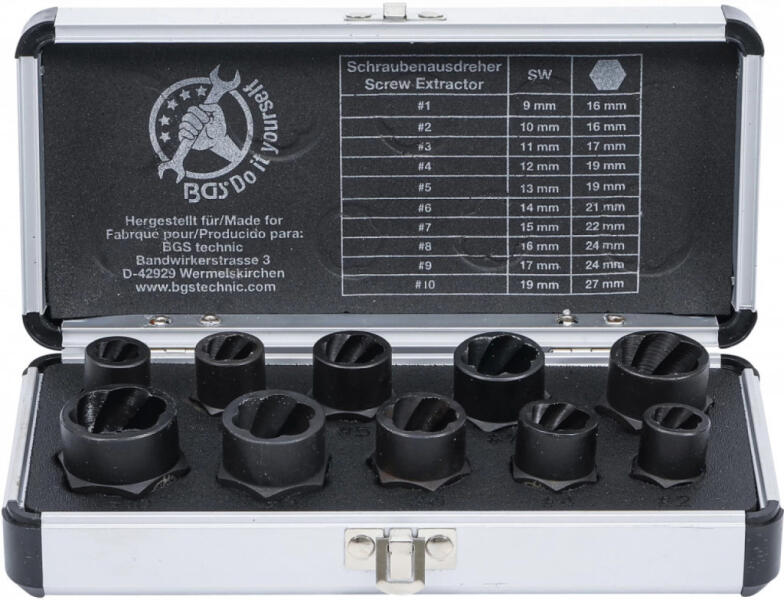 BGS DIY Set capete chei tubulare profil spiral / Extractoare de șuruburi | 10 mm (3/8") / hexagon exterior | 9 - 19 mm | 10 piese (BGS 20210)