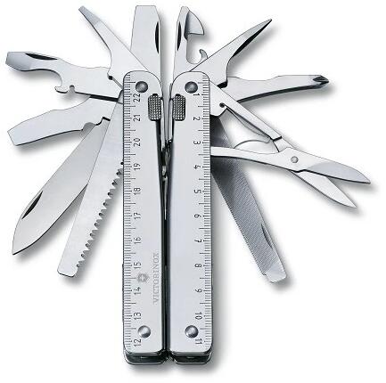 Uneltele multifuncționale includ. Clește subțire. Șurubelniță de 2 mm. Șurubelniță de 3 mm. Foarfece pentru sârmă subțire și moale de până la 40 HRc. desfăcător de sticle. Șurubelniță de 6 mm. rangă. lamă mare. foarfecă. fișier de fier. ferăstrău. ferăstrău de lemn. pumn, alezaj. Șurubelniță Phillips 1+2. Daltă.